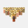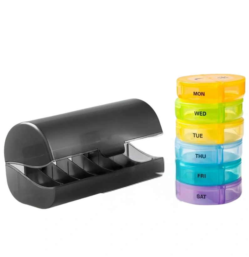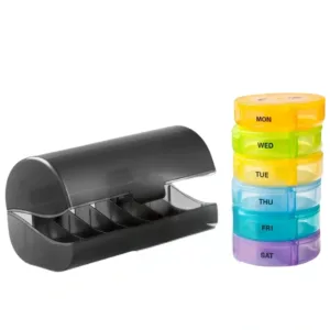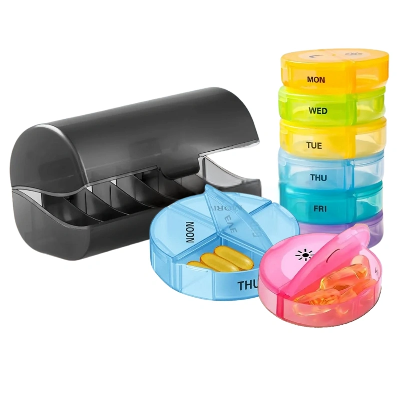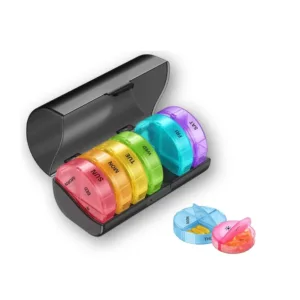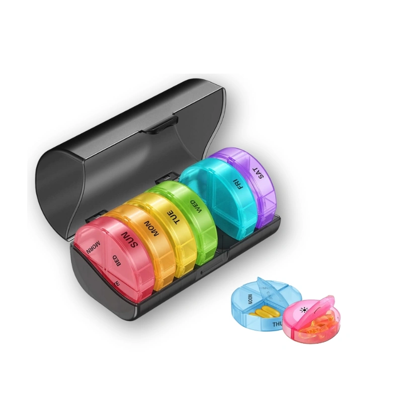 Vibrant Colours: This product features a colourful array of transparent cases containing vividly hued pills or capsules in the rainbow spectrum.